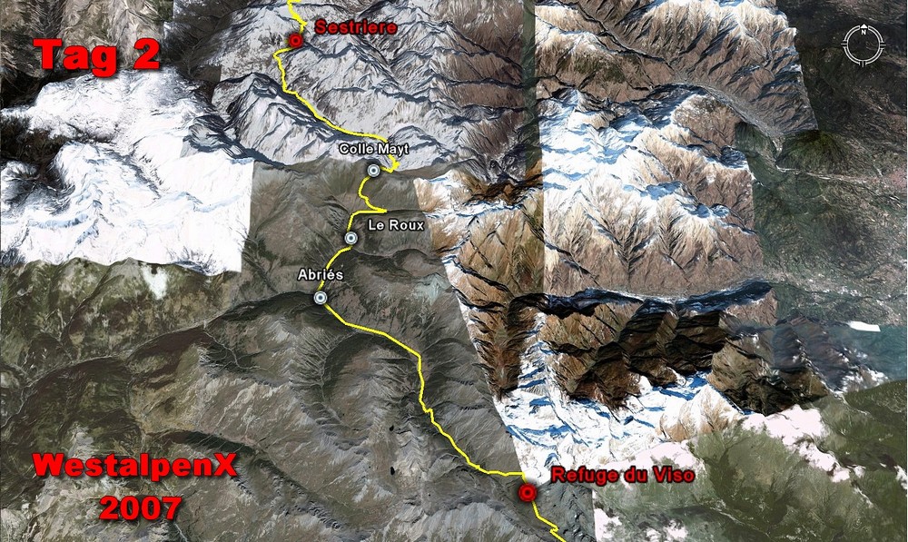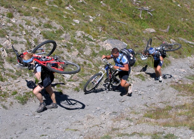 Oh ja, dachte sich Sandra, beendete umgehend die allmorgendliche Bikepflege und schoß hinter uns her... um dann aber völlig enttäuscht feststellen zu müssen, daß wir nicht bei dem schicken Sportgeschäft haltmachten, bei dem sie sich schon am Vorabend in ein hinreißend hellblaues Paar Carving-Ski verliebt hatte, sondern ganz trivial den örtlichen Lebensmittelladen ansteuerten...